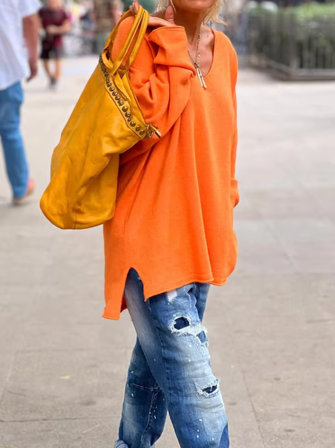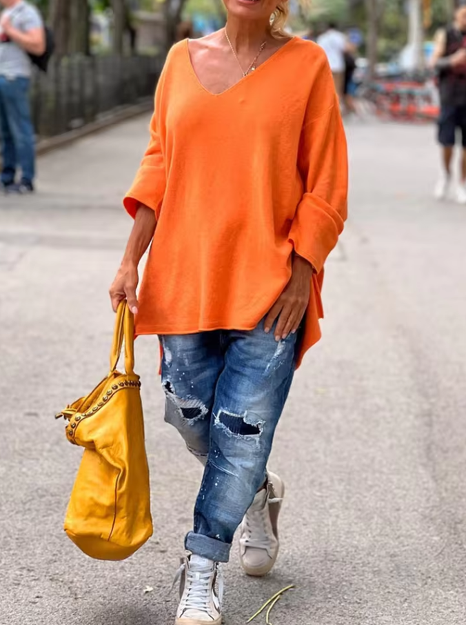 Lockerer langer Strickpullover für Damen mit V-Ausschnitt